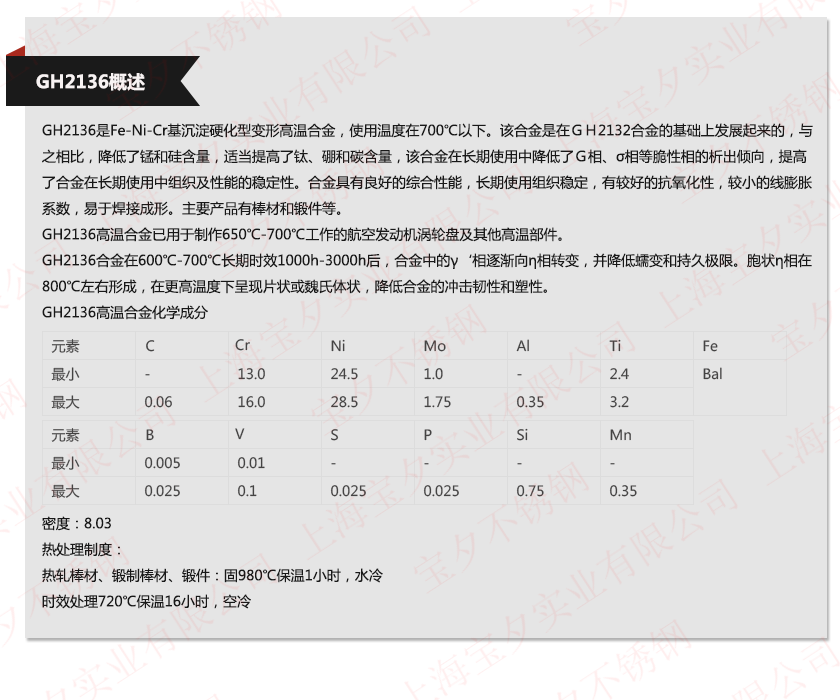 上海宝夕实业—GH2136材质单,上海宝夕实业—GH2136成分表,上海宝夕实业—GH2136是什么材料