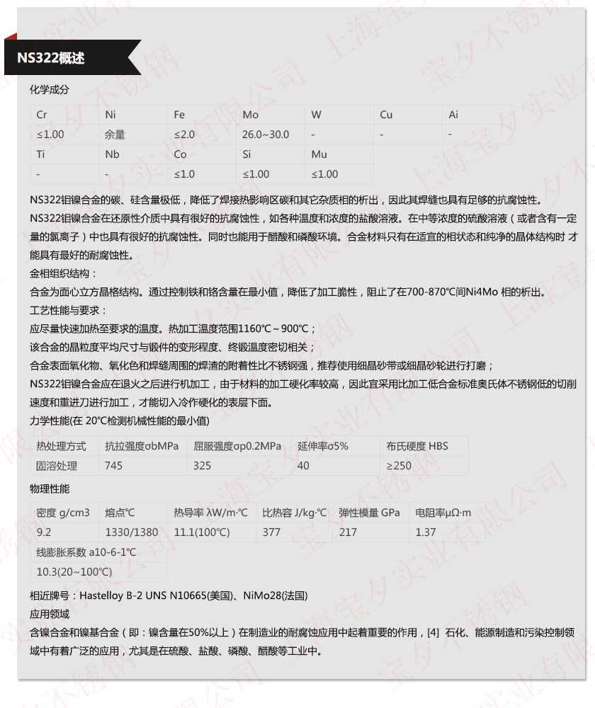 上海宝夕实业—NS322材质单,上海宝夕实业—NS322成分表,上海宝夕实业—NS322是什么材料